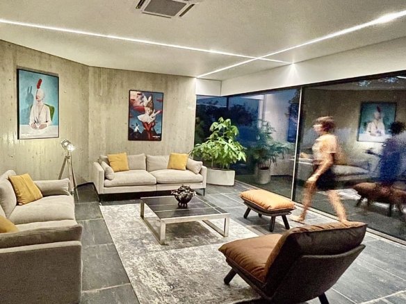 The villa’s 14×4-meter infinity pool with an overflow edge and integrated hot tub provides the perfect setting for relaxation. Surrounding the villa is a beautifully landscaped garden, meticulously designed with an automatic irrigation system.